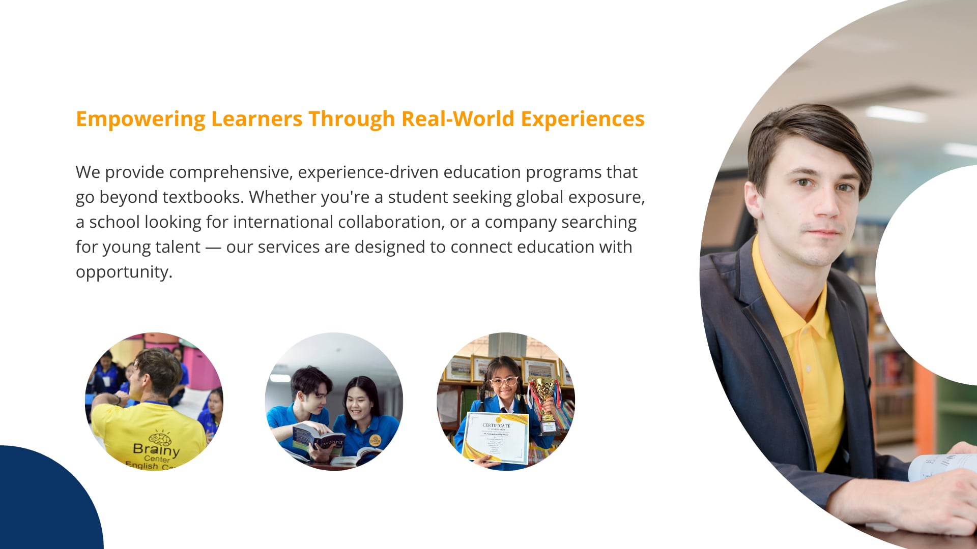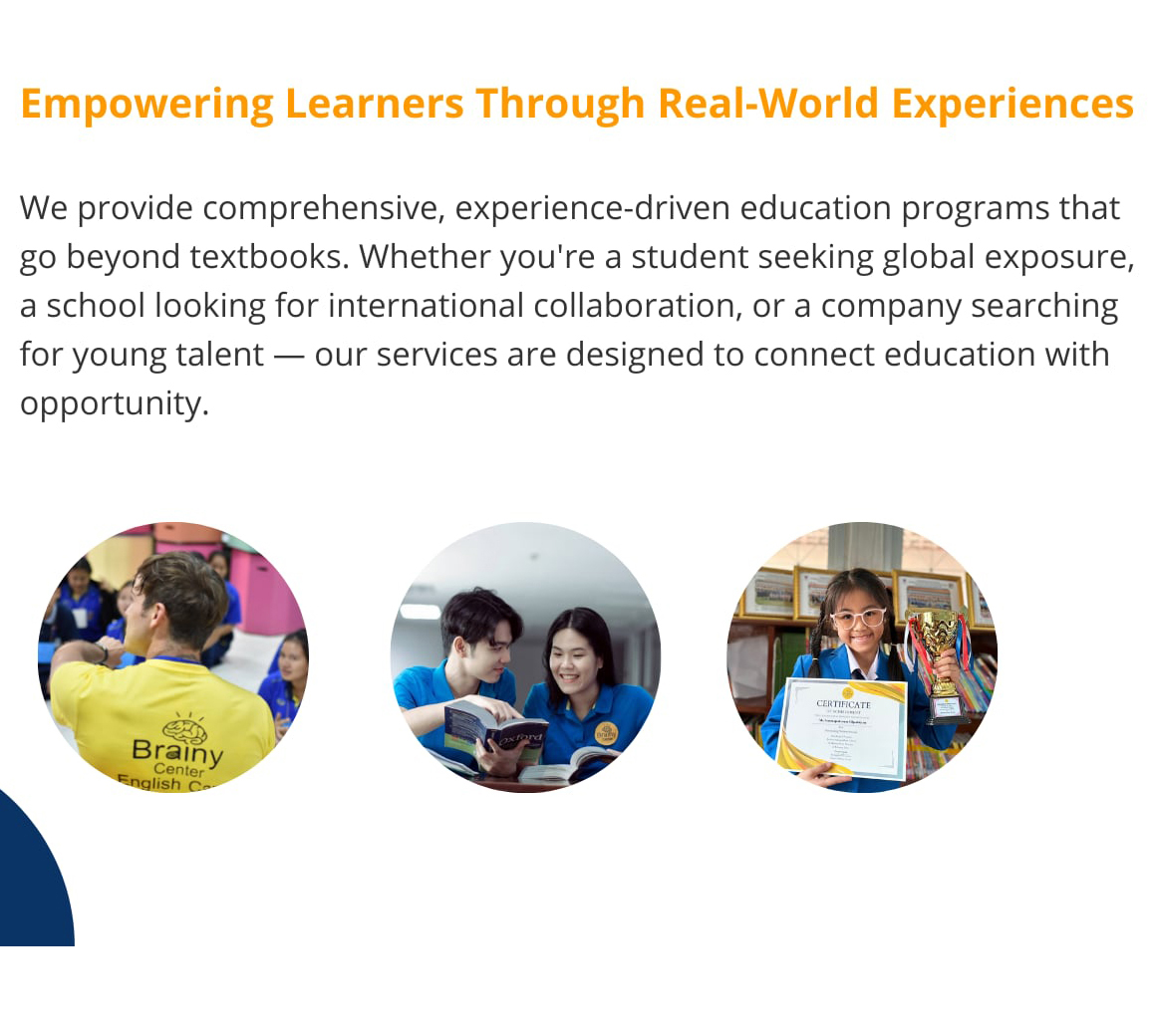 ทีมงานเรามีความมุ่งมั่นในการ สร้างสรรค์การเรียนรู้ผ่านรูปแบบกิจกรรมในหลายรูปแบบทั้งค่ายและกิจกรรม ส่งเสริมการเรียนรู้ ให้ความรู้ที่เน้น ความสนุกและมีกิจกรรมที่สร้างสรรค์ เรานำวิชาการมาถอดบทเรียนให้อยู่ในรูปแบบกิจกรรมที่ช่วยส่งเสริมการเรียน ทั้ง ด้านภาษาอังกฤษ วิทยาศาสตร์ คณิตศาสตร์ และเทคโนโลยีดิจิตอล ผ่านการจัดกิจกรรมในรูปแบบ ทั้งในรูปแบบ Active Learning ด้วยการเรียนรู้ตามมาตรฐานการหน่วยชี้วัดและ มาตรฐาน CEFR